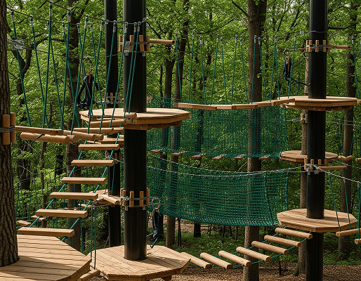Современные веревочные парки гармонично вписываются в природный ландшафт, сохраняя естественную среду при создании безопасных трасс. Основа здесь — прочные деревянные платформы, закрепленные на деревьях или металлических опорах, соединенные между собой разнообразными переходами. Посетители перемещаются по подвесным мостам, канатным дорогам и другим препятствиям, используя профессиональную страховочную систему. Каждый маршрут имеет четкую градацию сложности: от детских трасс на высоте 1-2 метров до экстремальных участков на уровне 10-15 метров.